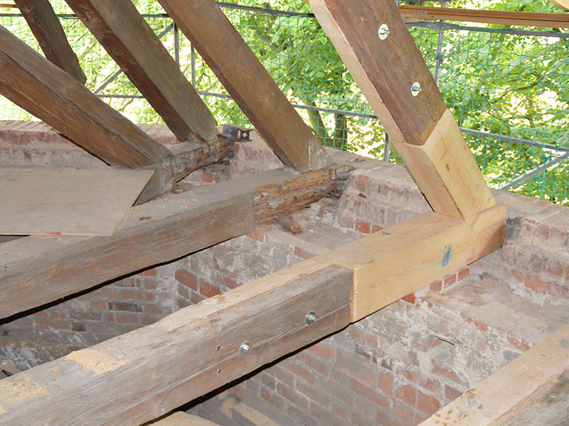 Als wichtigste Sachen im Bereich des ersten Bauabschnittes wurden alle 47 Balkenköpfe und Dachsparrenenden erneuert. Ein Ringanker ist in die Mauer eingearbeitet worden, teils gemauert, teils gebohrt. Das Dach des ersten Bauabschnittes wurde neu gedeckt.