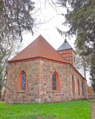Vor ca. 455 Jahren wurde die erste Kirche in Berge erwähnt. Sie war aus unbehauenen Feldsteinen errichtet worden und über ihre ursprüngliche Form kann man nicht viel sagen. Im Jahre 1868 erfolgte eine komplette Umgestaltung der Berger Kirche. Es wurde die Apsis angebaut und eine Gestaltung des Altarraumes vorgenommen. Ein Kanzelaltar schmückte die Kirche mit einem Aufgang von rechts. Im Kanzelkorb und an den Seitenstelen waren Apostelfiguren angebracht, von denen heute leider nur noch drei ganze und eine zerstörte erhalten sind. Sie stellen die Apostel Petrus, Johannes, Andreas und Paulus dar. Am 29. Dezember 1868 erfolgte die Einweihung der restaurierten Kirche in Groß Berge durch Superintendent Hoffmann. Vor dem Altar befinden sich zwei Gräber der Winterfelds von Karwe. Sie sind heute zugemauert.