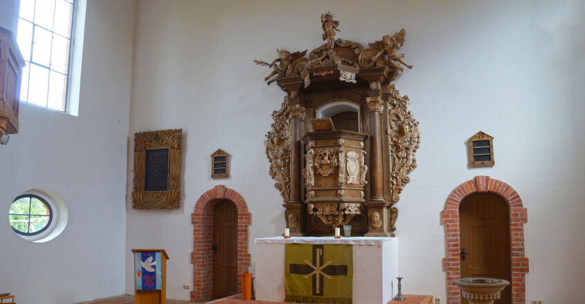 Kanzelaltar um 1700 aus dem Vorgängerbau, mit reichem Schnitzwerk, Aufbau mit zwei Säulen, gebrochenem Gesims und Verdachung mit sitzenden Engeln. Schalldeckel mit Christusfigur. An der Kanzelbrüstung Wappen der Familie von Arnestorff.