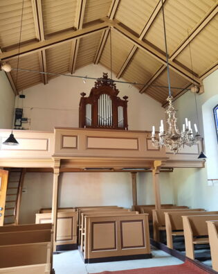 Die Orgel 1888 von Albert Hollenbach aus Neuruppin, in Anlehnung an den Altar mit reichem Schnitzwerk. Kleinster Orgeltyp mit zwei Manualen von Hollenbach.