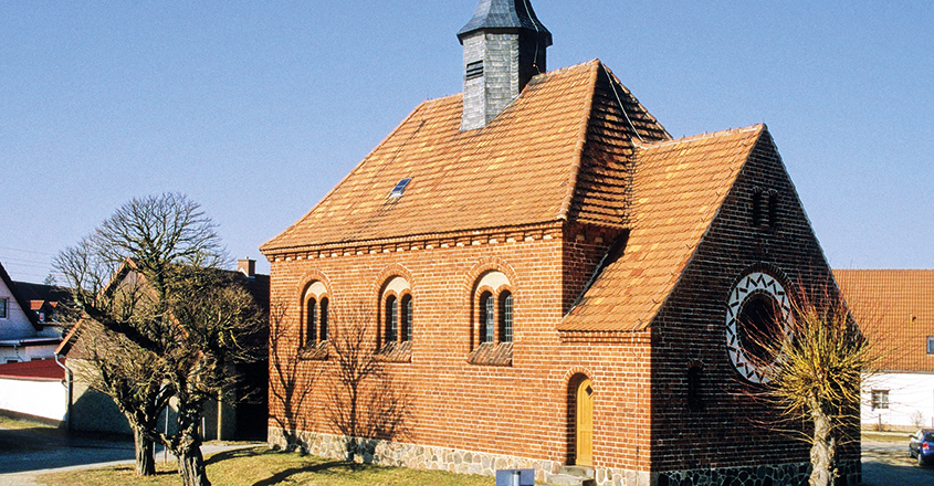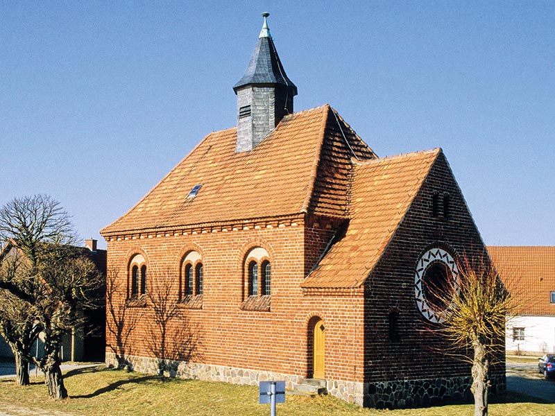Neuromanischer Backsteinbau von 1908, der Chorschluss in Gebäudebreite, mit Rundfenster. Oktogonaler verschieferter Dachturm.