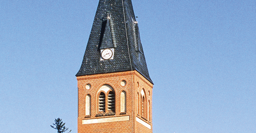Flachgedeckter neugotischer Backsteinsbau von 1904 mit eingezogenem Westturm und Sakristei im Osten, anstelle eines mittelalterlichen Baues.