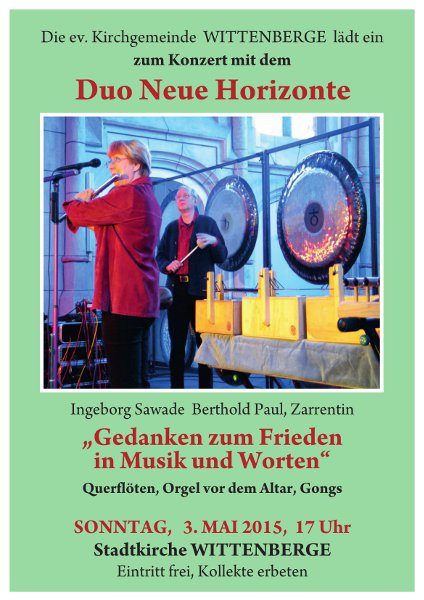 Unter dem Motto „Gedanken zum Frieden in Worten und Musik“ gastiert das Duo Neue Horizonte mit Ingeborg Sawade und Berthold Paul aus Zarrentin in Wittenberge.