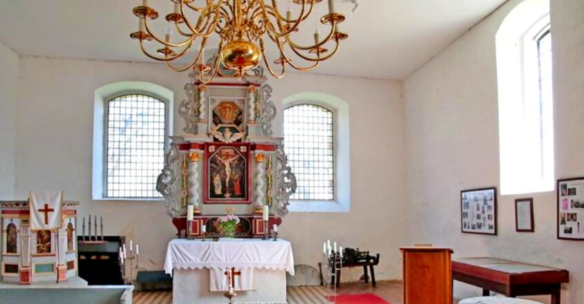 Zweigeschossiger Altaraufsatz, signiert G. Schwarz (Nigrinius) 1720, restauriert 1860. Im Hauptfeld Kreuzigungsgemälde, darüber Auferstehung, jeweils gerahmt von gedrehten Säulen und Akanthuswangen; in der Predella Abendmahl. Kanzel 1636 von J. Protzen, in den Bogenfeldern des polygonalen Korbs gemalte Halbfiguren der vier Evangelisten von L. von Zieten (restauriert). Hölzerne Taufe, 17. Jahrhundert.
