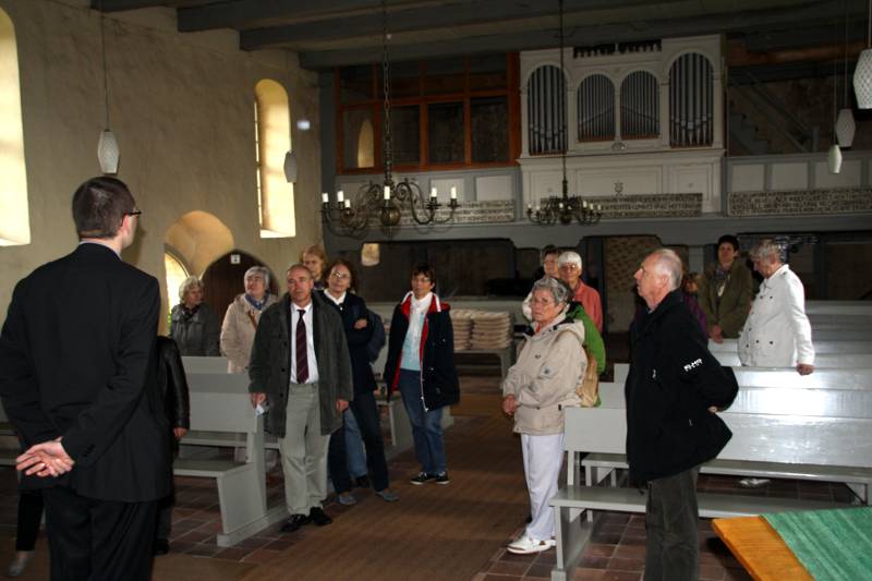 Begonnen wurde, mit einiger Verspätung, im Land.Pfarr.Haus. Museum im Pfarrhaus Blüthen. Herr Wolf, der Vorsitzende des GKR, führte durch das Ensemble. In der nächsten Station, der Kirche in Sükow, wartete bereits Pfarrer Preisler. Seinen Ausführungen über die Besonderheiten eines Pfarrsprengels auf dem Lande wurden aufmerksam verfolgt und mit den Bedingungen in Berlin verglichen. Nach einem Mittagessen in einem bekannten Gasthof in Glövzin ging die Reise weiter nach Perleberg. Dort berichtete der amtierende Bürgermeister über die wirtschaftliche und demografische Entwicklung der Stadt. Zum Abschluss ging es an die alte Wirkungsstätte von Superintendent Furian, die Stadtkirche St. Jacobi. Die Gäste konnten einer Bläserprobe unter Leitung von Dr. Draeger beiwohnen. Unser amtierender Superintendent, Pfarrer Kuhn, führte durch die altehrwürdige Kirche und wusste Interessantes aus Geschichte und Gegenwart zu erzählen.