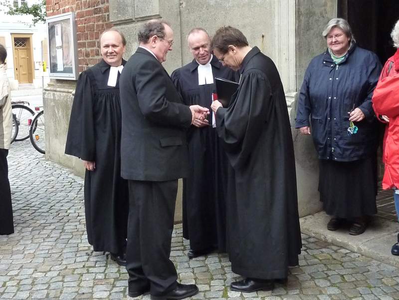 Am 3. Oktober predigte der Bischof dann im Gottesdienst zum Erntedankfest und dem 20. Jahrestag der deutschen Einheit in Lenzen. Warum gerade in Lenzen? Weil dort in all den Jahren zuvor der Tag der deutschen Einheit mit einer geistlichen Besinnung begonnen wurde. In seiner Predigt wies der Bischof darauf hin, was sich in den letzten 20 Jahren positiv in Kirche und Gesellschaft verändert hat. Er erinnerte daran, welchen Anteil wir in unseren Gemeinden daran hatten und haben. Wir dürfen dankbar sein und haben Resignation nicht nötig! An dem festlichen Gottesdienst nahmen auch Vertreter der Partnerkirchengemeinde aus Villingen im Schwarzwald teil; ein schönes Signal an diesem besonderen Tag!