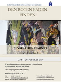 Unter anderem gibt es ein Biografie-Seminar „Den roten Faden finden“ mit Jutta Loch aus Berlin. Gibt es in allem, was wir erleben, so etwas wie einen roten Faden, ein Muster oder einen Sinn? Einen Zusammenhang, der im Voraus nicht deutlich wird, sich aber in der Rückschau erkennen lässt?