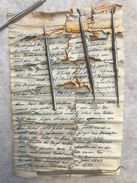 Der Restaurator Hendrik Seipt aus Wittstock hat sehr viel Mühe aufgewendet, um den völlig verwitterten Text aus der Turmkugel der Freyensteiner Marienkirche zu rekonstruieren. Hier können Sie ihn lesen: