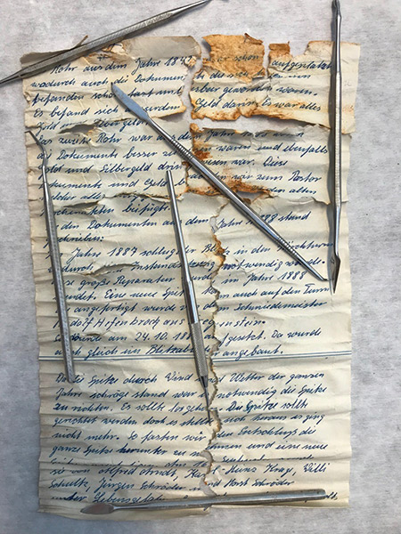 Das Rohr aus dem Jahre 1843 war schon aufgeplatzt, wodurch die Dokumente, die sich hier drin befanden unlesbar geworden waren. Es befand sich außerdem Geld darin. Es war alles Gold und Silbergeld. Das zweite Rohr war aus dem Jahre 1888, worin die Dokumente besser zu lesen waren und ebenfalls Gold und Silbergeld drin gewesen war. Diese Dokumente und Geld brachten wir zum Pastor, welcher alles entgegennahm und es zu den alten Kirchenakten beifügte. In den Dokumenten aus dem Jahre 1888 stand geschrieben: „Im Jahre 1887 schlug der Blitz in den Kirchturm, wodurch die Instandsetzung notwendig wurde. Diese große Reparatur wurde im Jahre 1888 beendet. Eine neue Spitze kam auch auf den Turm, die angefertigt wurde von dem Schmiedemeister Rudolf Hefenbrock aus Freyenstein. Sie wurde am 24.10.1888 aufgesetzt. Da wurde auch gleich ein Blitzableiter angebaut.“ (Striche...) Da die Spitze durch Wind und Wetter der