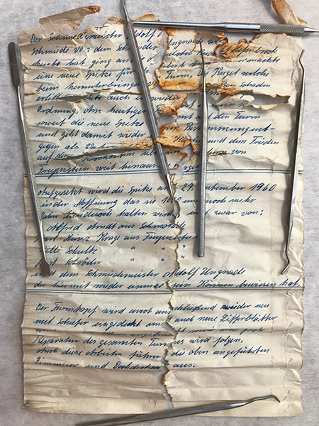 Nun kam das umstrittene Gerede aus dem Volksmund, was wohl in der Kugel sein möge. Von älteren Männern hörte man, es sollen zwei Rollen Geld darin liegen, andere dagegen sprachen von Papieren und einige vermuteten gar nichts. Das Rätsel sollte gelöst werden und wurde es auch. Am 5. September 1960 gingen wir Dachdecker daran, das Rätsel zu lösen und öffneten die Kugel, welche schon durchschossen war und fanden zwei Kupferrohre, die an den Enden mit einem Deckel versehen waren. Wir öffneten sie und tatsächlich lag Geld darin. Das eine Rohr stammte aus dem Jahre 1843 und das andere aus dem Jahre 1888.