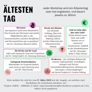 Eingeladen sind alle interessierten Gemeindeglieder und Älteste zu verschiedenen Workshop, von denen zwei besucht werden können. Jeder Workshop dauert rund 90min.