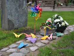 Zum Glas-Schmetterling auf dem Stein gesellten sich an diesem Nachmittag weitere aus Papier gefalzte Schmetterlinge. Von den Teilnehmern der kleinen Trauerfeier waren sie zuvor mit Wünschen und Gedanken an die verstorbenen Kinder, deren Mütter und Väter beschrieben worden.