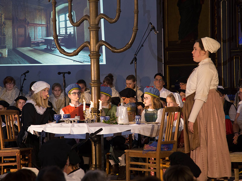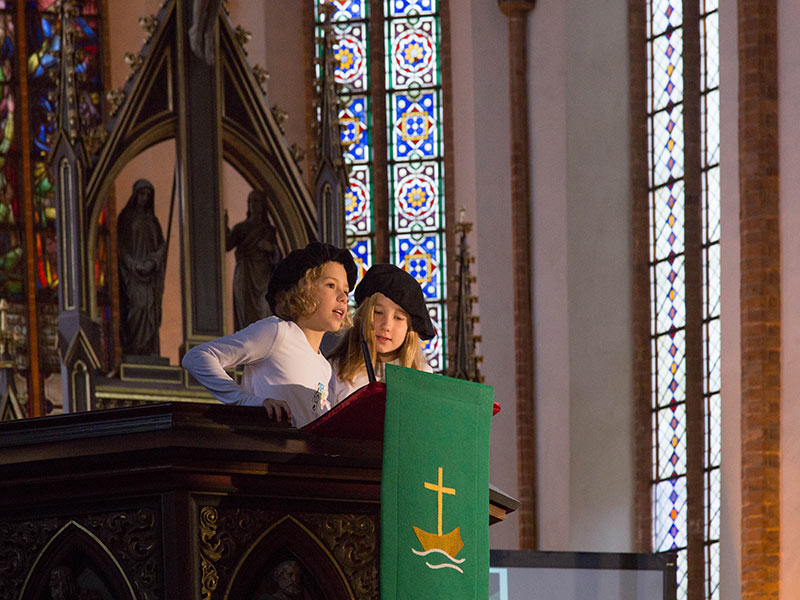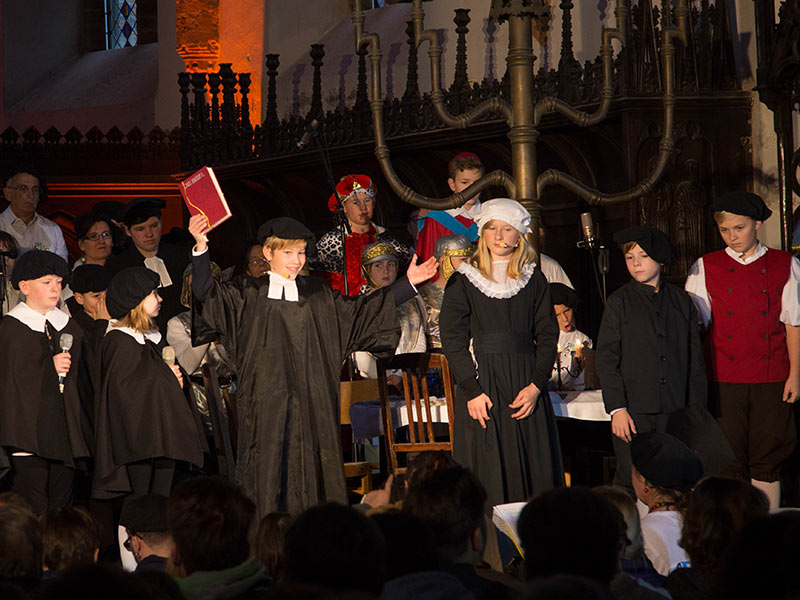 Beeindruckend wie viele Kinder bei diesem Musical zu sehen sind. Unter der Leitung von Isabella-Scholz-Glomke und Kantorin Dorothea Uibel kann ich ein sehr professionell umgesetztes Musical genießen. Ich staune: Dieser Luther kann singen! Und wie viel Text die einzelnen Kinder im Kopf haben.