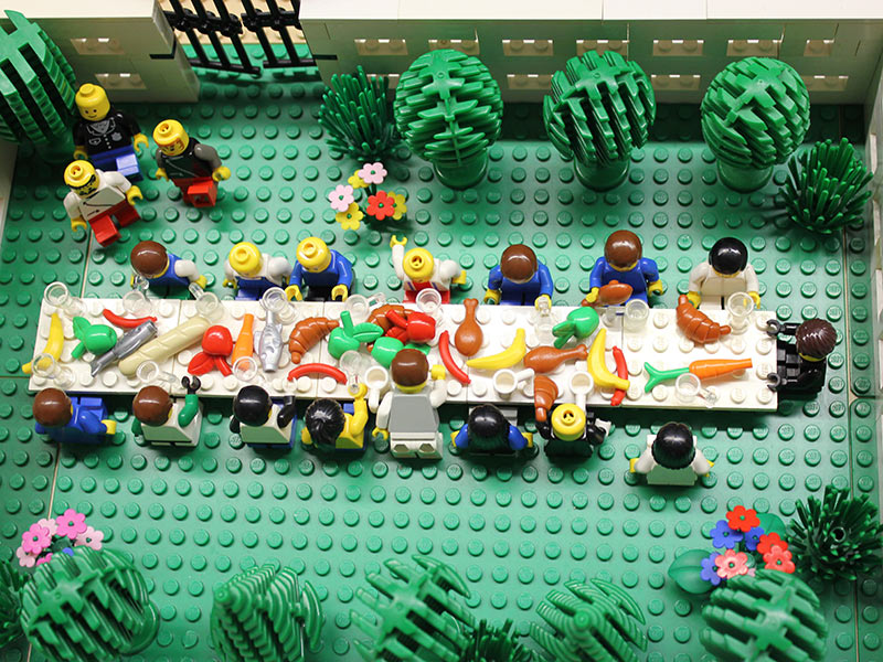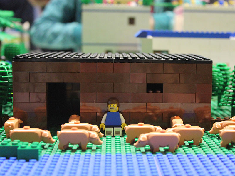 Innerhalb einer Woche hörten und erlebten die Kinder mit ihm die biblischen Geschichten – mal mit Bechern, mit Gläsern und Konserven oder mit handgefertigten Figuren – und bauten diese mit LEGO® nach. Am Ende der Woche entstand so eine riesige Erzähllandschaft. Nebenbei lernten die Mädchen und Jungen Lieder und Texte eines kleinen Musicals über den verlorenen Sohn kennen, welche wir am Sonntag im Familiengottesdienst zusammen mit der neuen Band von Dorothea Uibel aufführten. Anschließend waren alle Besucher eingeladen, die Erzähllandschaft zu bewundern.