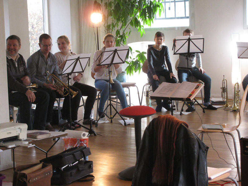 13 Bläserinnen und Bläser und einige Bläser des dortigen Chores probten unter der Leitung des Orchestermusikers Chrisoph Draeder etwas, wofür in den wöchentlichen Proben wenig Zeit bleibt - Unterhaltungsmusik und Swing. Die Arbeit mit em Instrument, ihm neue Töne zu entlocken, sich in den Rhythmus hineinspielen und dabei noch die Blastechnik zu verbessern war Ansporn, Ziel und Freude zugleich. Das Spielen wurde freier, auch wenn ´mal ein Ton weggelassen und im Eifer ein "B" übersehen wurde.