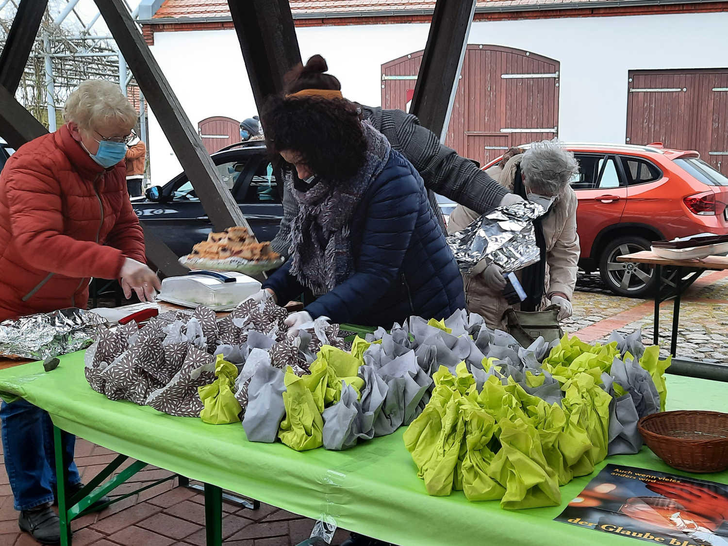 Fleißige Helfer*innen aus der Gemeinde hatten Kuchen verpackt - so konnte jeder, der wollte, noch ein Stückchen mit nach Hause nehmen, musste doch das klassische Kaffeetrinken aufgrund der Corona-Situation entfallen. Viele Gemeindeglieder und Wegbegleiter ließen es sich nicht nehmen, noch Grußworte an Johannes Kölbel zu richten.
