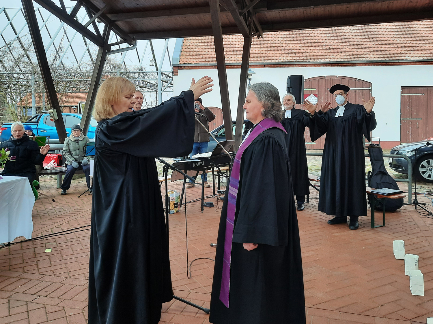 Sechs Jahre hatte Johannes Kölbel den Pfarrsprengel geleitet und griff in seiner Predigt die schönen aber auch traurigen Momente auf - Hochzeiten, Taufen und Feste und natürlich Beerdigungen und bedrückende Begebenheiten. Begleitet wurde der Gottesdienst von den Bläser*innen aus der Region Schwante/Oberkrämer/Vehlefanz.