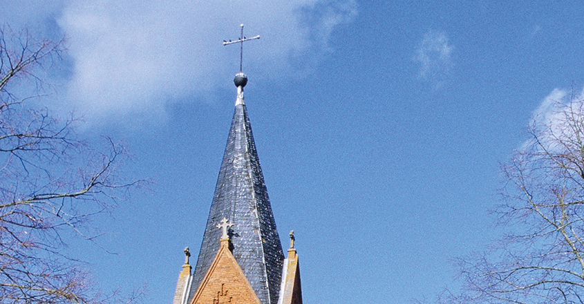 Neugotischer Backsteinbau mit eingezogener polygonaler Apsis und schlankem Westturm von 1883–85. Das Äußere durch Strebepfeiler und Spitzbogenfenster gegliedert. Instandsetzung 1987/88.