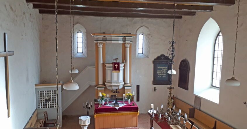Innen Westempore auf Holzsäulen, spätes 17. Jh., im 19. Jh. verändert. Barocker Kanzelaltar, Anfang 18. Jh.