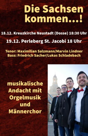 Am Wochenende vom 18. - 19. Dezember machen sich wieder vier Studenten der beiden Dresdner Musikhochschulen auf, um im Kirchenkreis Prignitz adventliche Konzerte zu geben. Inhaltlich wird es ein buntes Programm geben aus Orgelliteratur aller Epochen sowie vierstimmiger Männerchorliteratur überwiegend aus der Romantik.