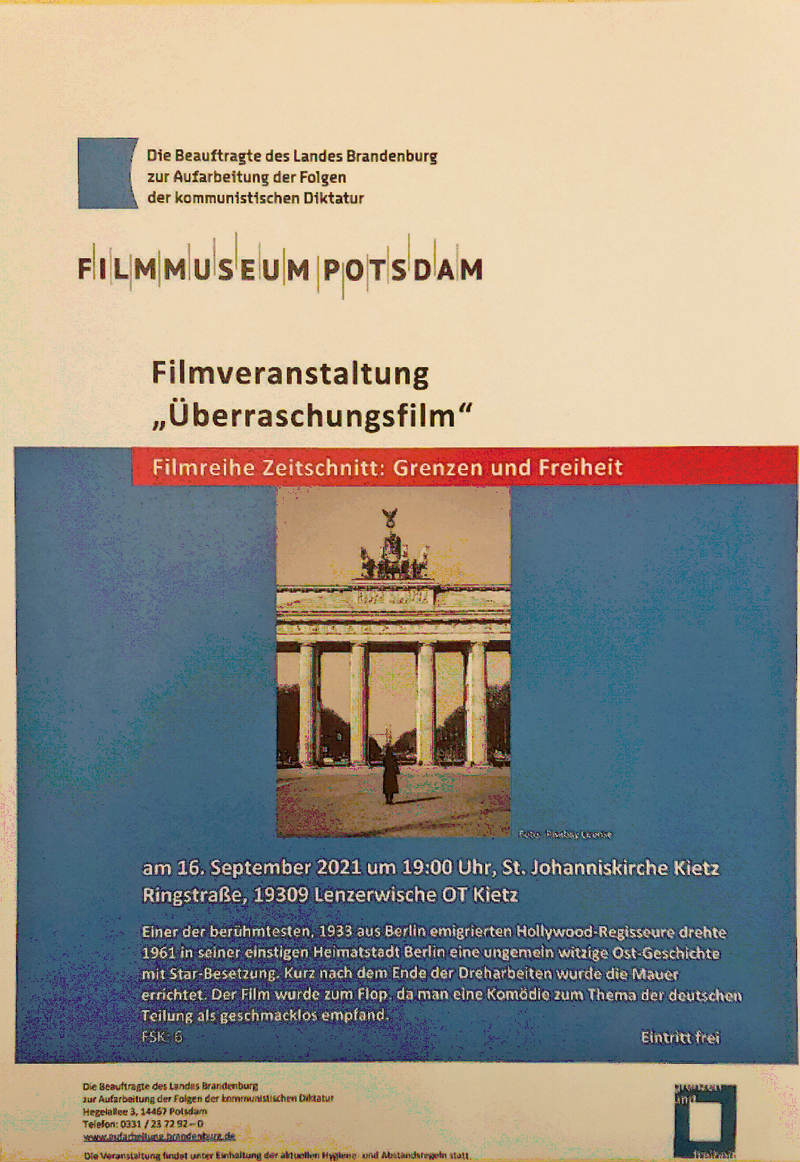 Der Film läuft innerhalb der Veranstaltungsreihe der Beauftragten des Landes Brandenburg zur Aufarbeitung der Folgen der kommunistischen Diktatur. Hier ein Auszug aus dem Flyer: "Wir gehen damit thematisch auf den 13. August 1961 ein: 2021 jähren sich der Mauerbau in Berlin und die militärische Befestigung der innerdeutschen „Grünen Grenze“ zum 60. Mal. Dieses im Wortsinne einschneidende Ereignis des Kalten Kriegs prägte fast 30 Jahre lang das bipolare Weltbild inmitten Europas. Erst infolge der Friedlichen Revolution im Herbst 1989 konnten die damit verbundenen Trennungen von Familien und Landschaften sowie die Teilung der Stadt Berlin überwunden werden. Deutschland beendete 50 Jahre nach dem von den Nationalsozialisten entfachten Weltkrieg die eigene Zweistaatlichkeit und wurde gleichzeitig zum Impulsgeber der europäischen Einigung. Unsere Filmreihe wird dieses historisch einzigartige Geschehen mit Filmen nachzeichnen – mal dokumentarisch, mal fiktonal, mal ernst, mal heiter, mal aus unmittelbaren und dann wieder aus rückblickenden