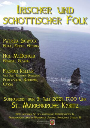 Wir laden Sie herzlich ein am Sonnabend, den 3. Juli 2021 um 17 Uhr in die St. Marienkirche Kyritz! Ein Irischer Abend... mit bekannten irischen Songs und lebhaften Tunes...!