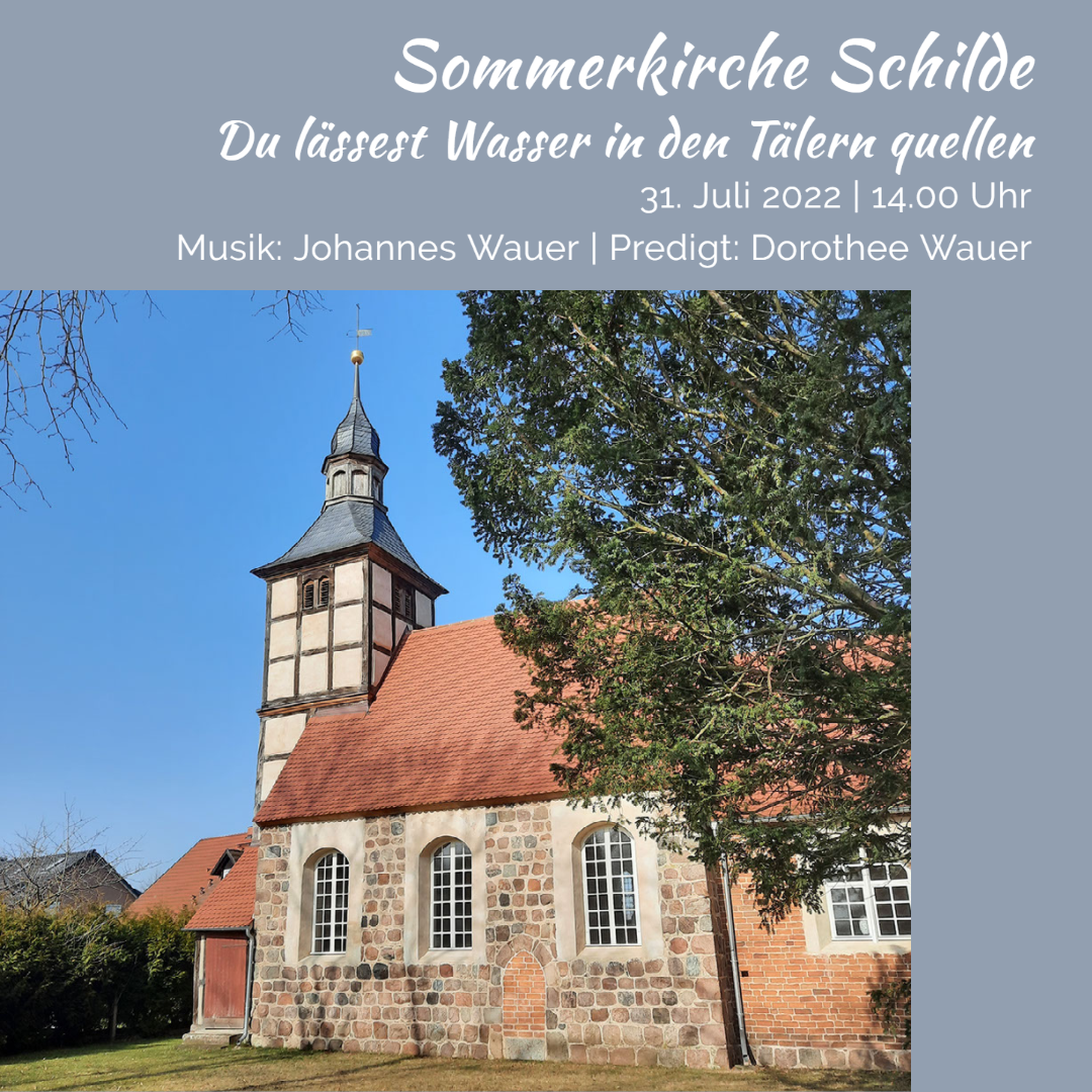 Am 31. Juli um 14:00 Uhr steht die Sommerkirche unter dem Thema „Du lässest Wasser in den Tälern quellen“ - die Liturgie/Predigt hält Dorothee Wauer, die Musik gestaltet Johannes Wauer.