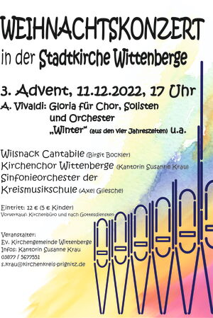Herzliche Einladung zum Weihnachtlichen Chorkonzert in der Stadtkirche Wittenberge. Am 3. Advent, den 11. Dezember 2022 um 17 Uhr erklingt das Gloria für Chor, Solisten und Orchester "Winter".