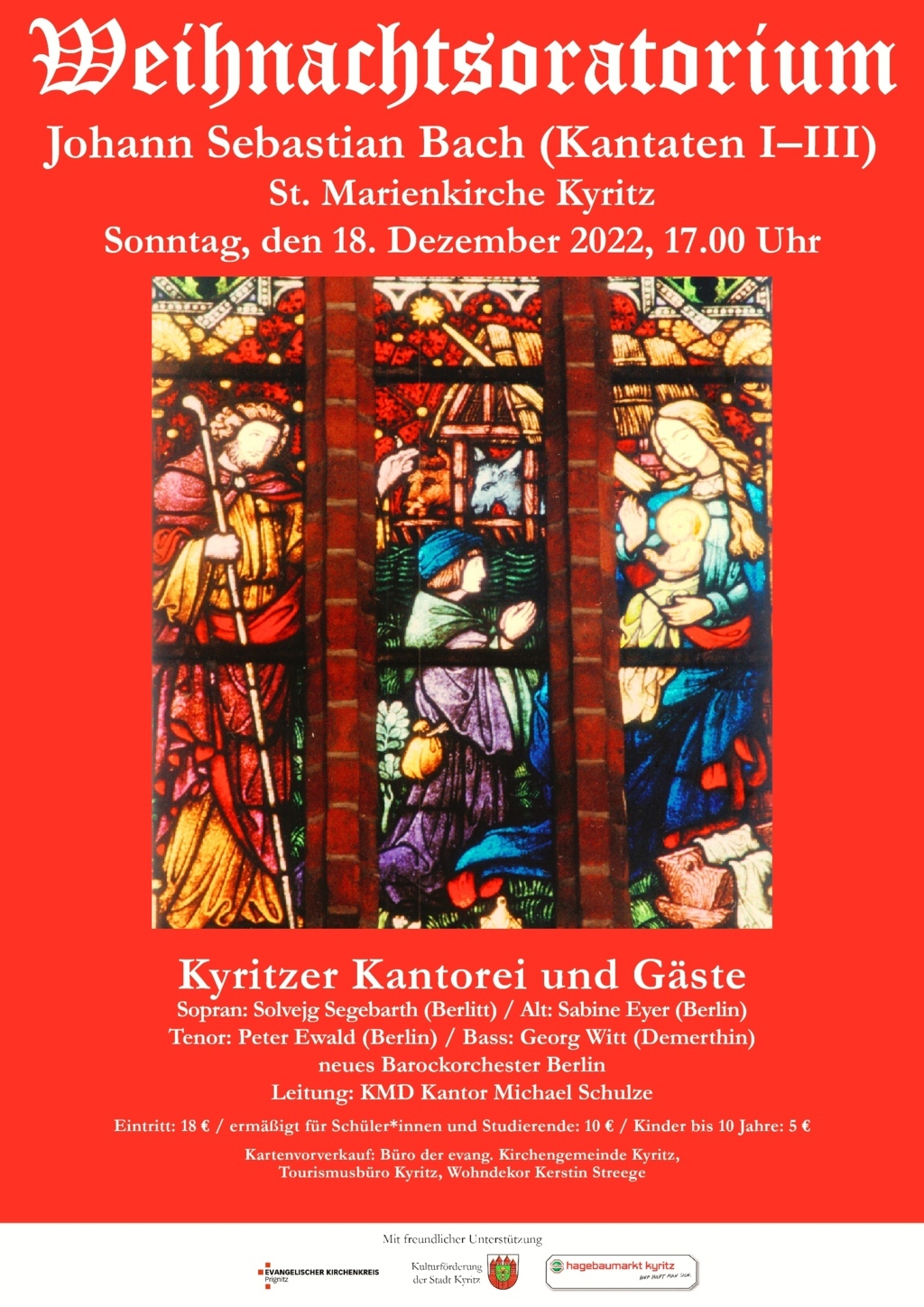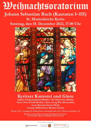 Die durch Gäste verstärkte Kantorei der evang. Kirchengemeinde wird unter der Leitung von KMD Michael Schulze die ersten drei Kantaten des Weihnachtsoratoriums von Johann Sebastian Bach aufführen. Das „neue barockorchester berlin“ begleitet die Kyritzer, Solisten aus der Region und dem Rundfunkchor Berlin übernehmen die Solopartien.
