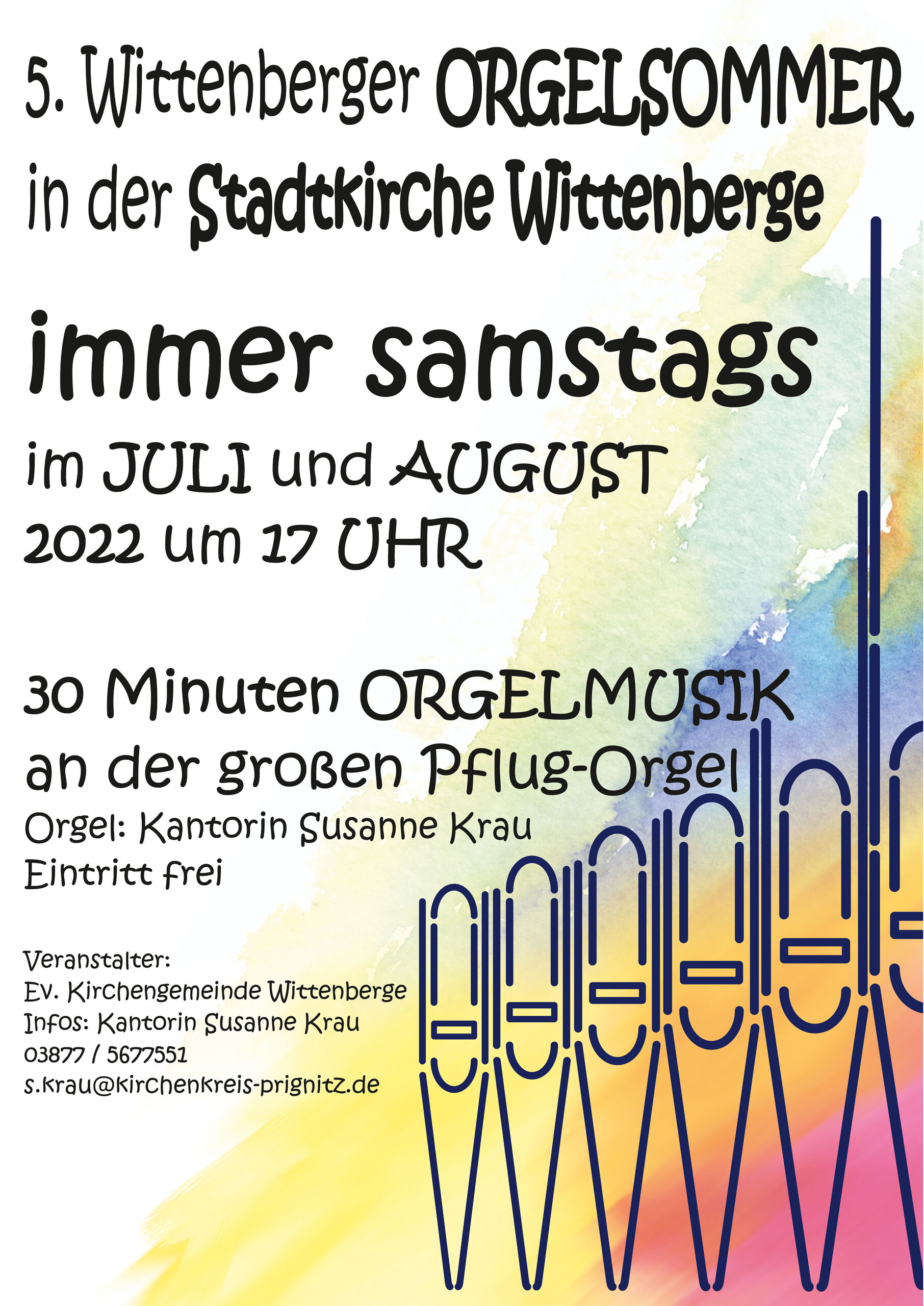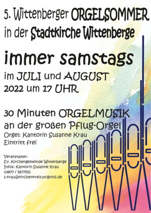 Herzliche Einladung zum "Wittenberger Orgelsommer“ - immer samstags im Juli und August jeweils um 17.00 Uhr mit Kreiskantorin Susanne Krau. Es erwarten Sie 30 Minuten unterhaltsame und abwechslungsreiche Orgelmusik.