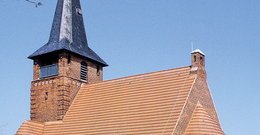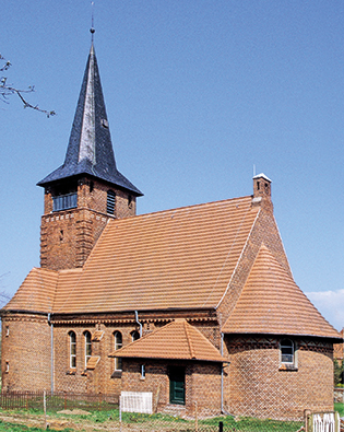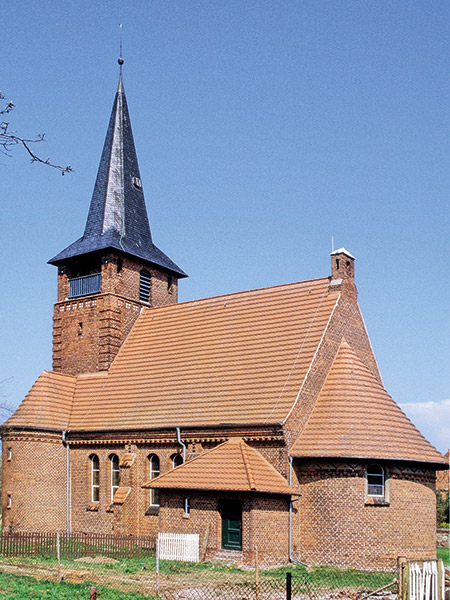 Die ehemalige Kirche nach Verlegung des Dorfes an alter Stelle abgerissen und 1691 etwas entfernt in Fachwerk neu erbaut, durch Brand zerstört. 1915 nach Entwurf von Georg Büttner Neubau in Backstein mit Apsis, Westturm und Arkadengang vor dem Südeingang. Im Heimatstil eklektizistisch neuromanisch mit expressionistischen Elementen. Das Kirchenportal 2005 restauriert.