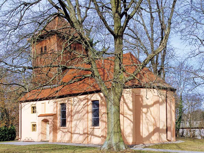 Verputzter Saalbau aus Backstein (1792) mit polygonalem Ostschluss und hölzernem westlichen Dachturm. Der ungewölbte Bau außen dicht mit flachen Strebepfeilern besetzt, stichbogige Fenster. Innen 1996 restauriert, dabei die Westempore, die Decke und der Dachstuhl größtenteils erneuert.