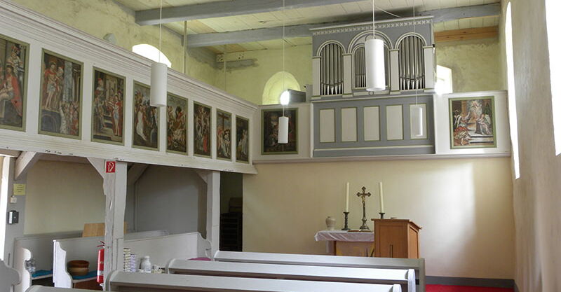 Rechteckige Feldsteinkirche (Saalbau) mit gleichbreitem Westquerturm, Anfang des 16. Jahrhunderts, Ostgiebel und Turmgiebel mit gereihten Backsteinblenden, gekuppelten Schallöffnungen im Turm unter breiter Spitzbogenblende, Fenster an Langseiten barock verändert, ein gotisches an der Ostseite. Innen flach gedeckt, der Ostteil nachträglich als Sakristei abgetrennt. Hölzerne Emporen im Norden und Osten, in den Brüstungsfeldern 16 Bilder aus dem Leben Jesu, 1. Viertel des 18. Jahrhunderts. Dorfkirche Barenthin Wohl von derselben Hand drei weitere Tafeln an der Südwand: Auferstehung, Gang nach Emmaus und Himmelfahrt, signiert und datiert Chr. L. Schlichting 1716, wohl von einem Altar. Altar mit Orgel verbunden (1844). Rokokokanzel, an die Westwand versetzt, mit verziertem Korb und Schalldeckel, in zwei Brüstungsfeldern gemalt Moses und Christus; auf dem Deckel zwei Engel mit Spruchbändern.