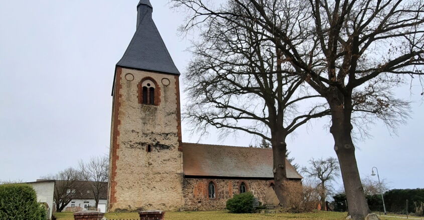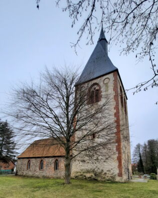 Rechteckiger Feldsteinbau, um 1500. Der Westquerturm mit gekuppelten Schallöffnungen unter spitzbogigen Blenden. Die ursprünglichen Schiffsfenster und das Nordportal zugesetzt. Die Spitzbogenfenster, der Ostgiebel und das Turmdach mit Dachreiter von 1855. Innen der Taufstein aus dem 13. Jh.