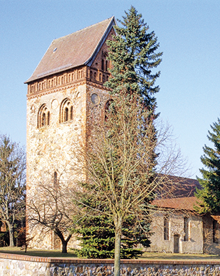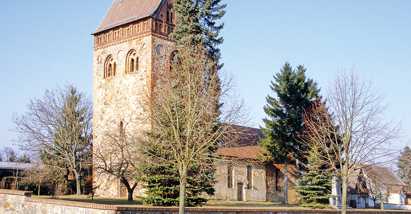 Im Kern frühgotischer Feldsteinbau mit eingezogenem, flachgeschlossenem Chor, 2. H. 13. Jh. Im Dreieck des Ostgiebels rechteckige Putzblende mit bauzeitlicher rankenförmiger Ritzung und Fassung, heute teilweise durch Stützpfeiler verdeckt. Der Kirchenbau im späten 15. Jh. um Querturm im Westen erweitert, das Oberteil in Backstein von 1890, mit gekuppelten Schallöffnungen. Spätgotisches Westportal in Spitzbogenblende, im Schiff große spitzbogige Fenster.