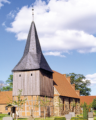 Kleine mittelalterliche Saalkirche von 1509 in den Abmaßen 16,5 x 9,00 m aus Feldsteinen mit Staffelgiebel aus Backstein auf der Ostseite und vorgebautem hölzernen Fachwerkturm von 1851.