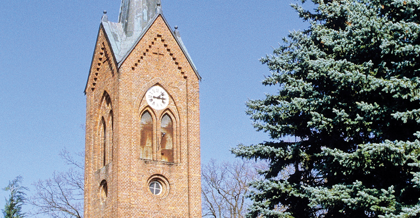 Rechteckige flachgedeckte Feldsteinkirche (Saalbau), ursprünglich aus dem 15. Jahrhundert, 1877 Bau des neugotischen Backsteinturms im Westen und rundbogige Veränderung der Fenster. Südlich vom Turm wurde nach 1950 ein Gemeinderaum (Luthersaal) angebaut.