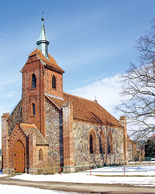 Neugotischer Feld- und Backsteinbau von 1854, mit polygonalem Ostschluss und Dachturm im Westen. Die Eckpfeiler in Fialen auslaufend, die Fensterlaibungen mit Backstein eingefasst. Der Vorgängerbau in Fachwerkbauweise dokumentiert.