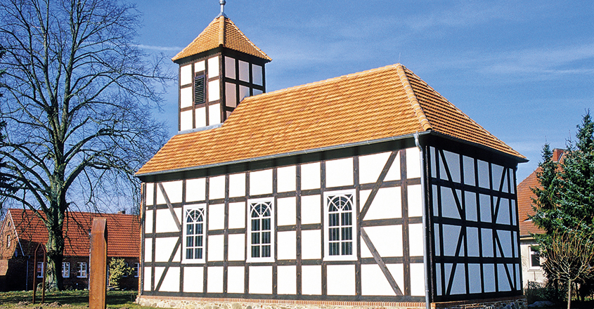 Fachwerkbau mit quadratischem, aufgesetztem Dachturm im Westen und Walmdach im Osten. Wetterfahne von 1825 (i), Dachwerk von 1824 (d). Westgiebel kurz nach der Errichtung in Backstein erneuert.