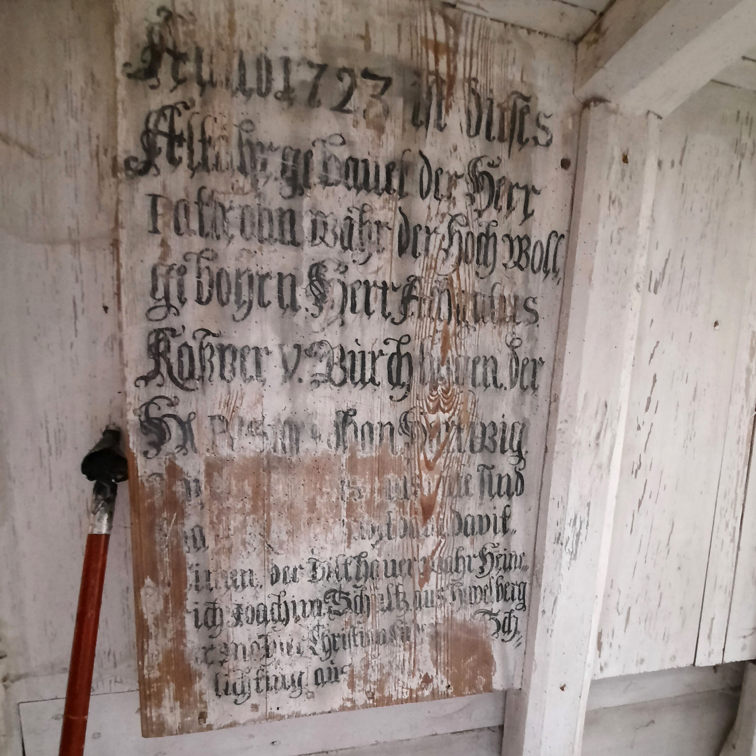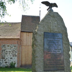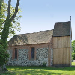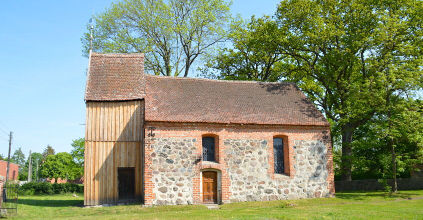 Spätgotischer Feldsteinbau, nach Brand des Ostgiebels 1889 erneuert, ebenso die flachgiebelförmig gebrochene Decke. Holzturm verbrettert von 1679 (d), auf Türsturz Inschrift von 1680 (i). Der Innenraum 2000 instandgesetzt.