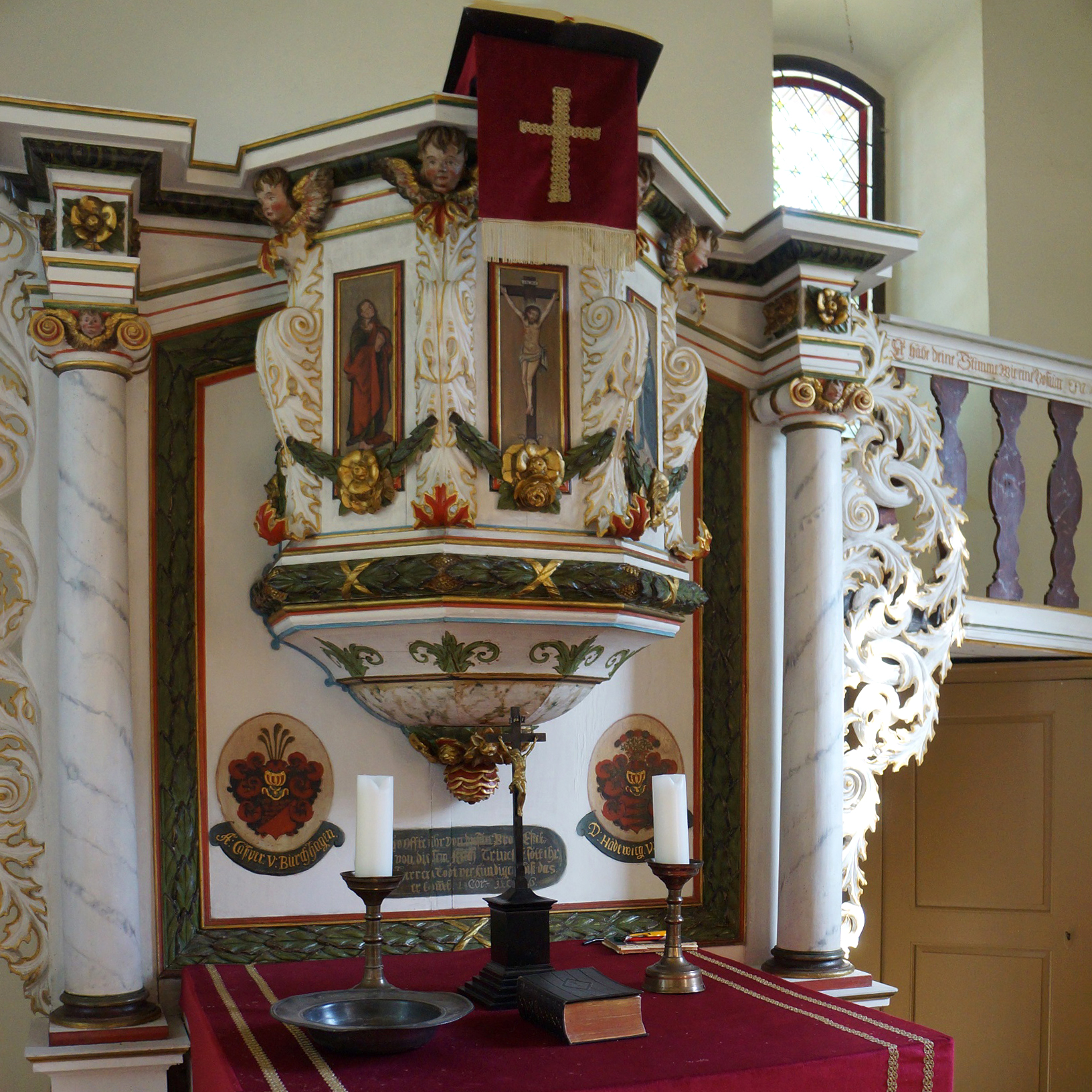 Innen barocker Kanzelaltar von 1723, der Kanzelkorb mit drei kleinformatigen Gemälden, gerahmt von Säulen und Akanthuswangen. Inschriftlich ein Werk des »Bildhauers« Heinrich Joachim Schultz aus Havelberg. Das Gestühl teilweise erhalten, eine Stiftung von 1723 durch Kaspar von Burghagen und Hedwig von Rohr.