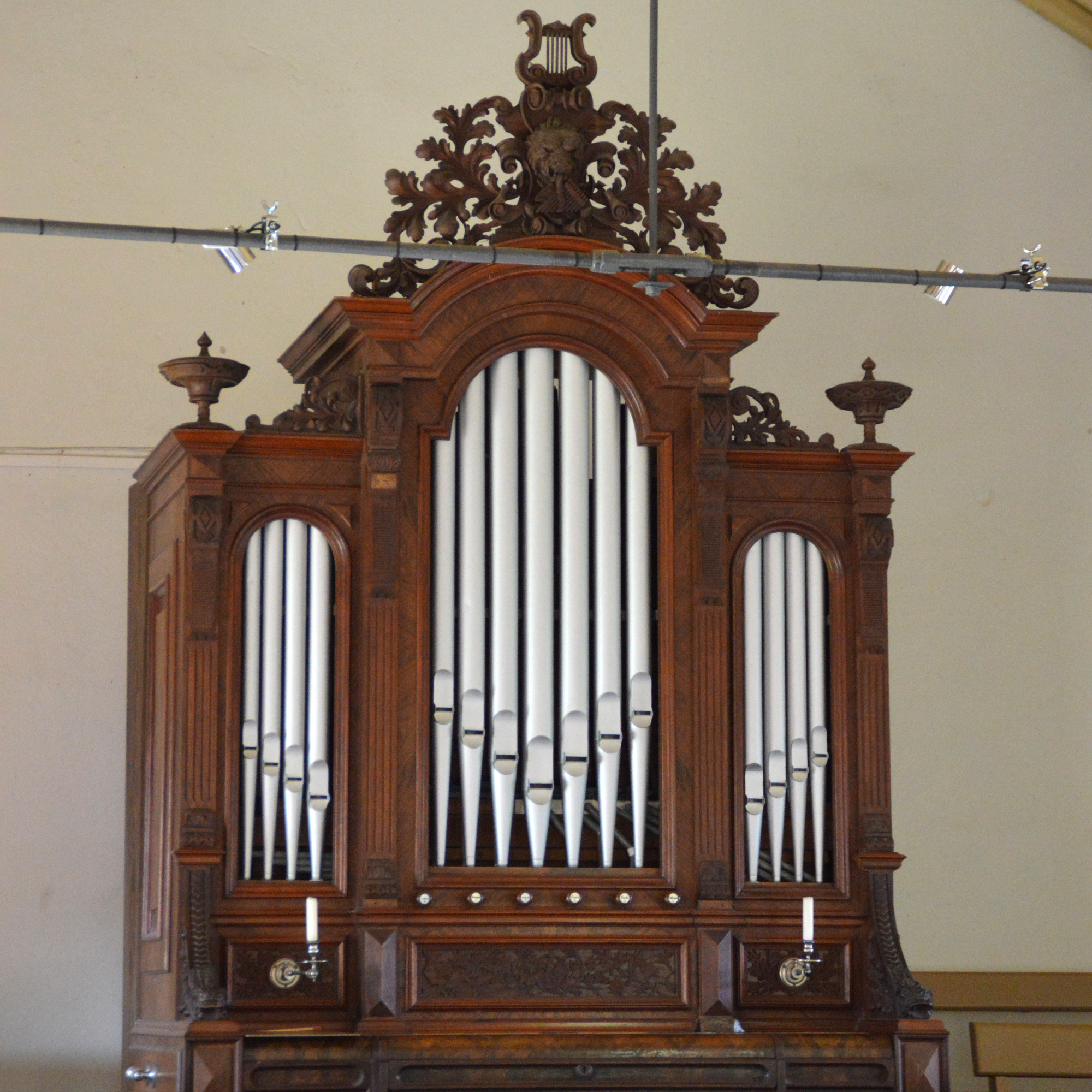 Die Orgel 1888 von Albert Hollenbach aus Neuruppin, in Anlehnung an den Altar mit reichem Schnitzwerk. Kleinster Orgeltyp mit zwei Manualen von Hollenbach.