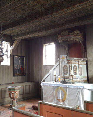 Kleine Fachwerkkirche in Saalform aus dem 17. Jahrhundert. Der quadratische Westturm aus Backstein um 1914. Die barocke Westempore wurde Anfang des 20. Jahrhunderts im Mittelteil erweitert und ebenso wie die Balkendecke mit Schablonenmalerei versehen. In die Fenster sind sieben Kabinettscheiben eingelassen, in Medaillonform mit Figuren und Wappen, gestiftet zwischen 1679 und 1692.