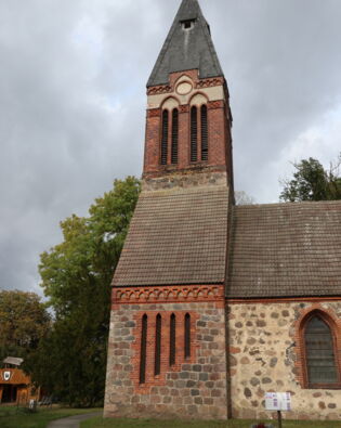 Gotische Feldsteinkirche (2. Hälfte des 14. Jahrhunderts), gestreckter Saalbau; vorgebauter neugotischen Westturm mit schwerem Aufsatz aus Backstein und Feldstein (um 1900); große Glocke 1719 von Christian Heinze in Berlin gegossen. Drei ursprünglich hohe Spitzbogenfenster in der Ostwand zugemauert, ebenso die westlich von zwei gotischen Portalen an der Südseite befindlichen Fenster. Die schweren Stützpfeiler nachträglich gebaut.