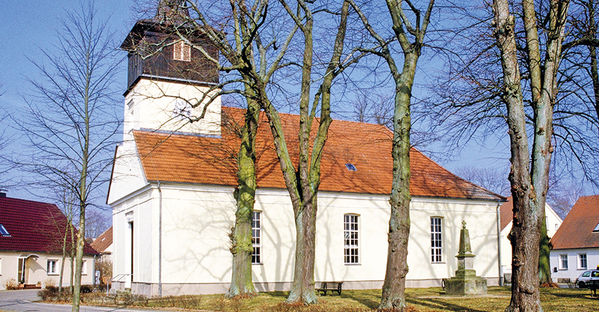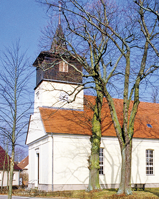 Kleiner verputzter Saalbau von 1778, über dem Westgiebel quadratischer Dachturm, sein Obergeschoss aus Holz mit verschieferter Spitze, darin zwei Glocken, die große 1799 von J. F. Thiele in Berlin gegossen, die kleine von 1472 mit Inschrift und Gießerzeichen.