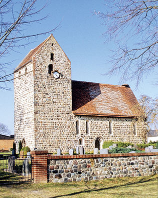 Einschiffiger Feldsteinquaderbau mit gleich breitem Westquerturm, 2. Hälfte des 13. Jahrhunderts; weitgehend unverändertes Beispiel einer frühgotischen Dorfkirche. Die schmalen, hohen Fenster sind teils rund-, teils spitzbogig, in der Ostwand drei gleich hohe Fenster; zwei spitzbogige Stufenportale an der Süd- und Nordseite, rundbogige Schallöffnungen am Turm.
