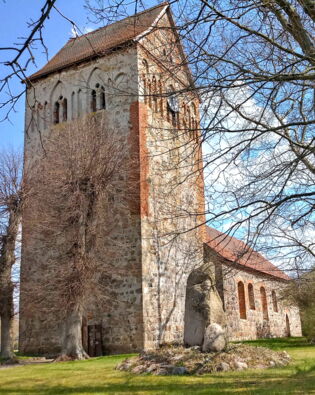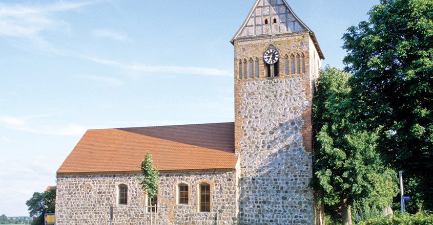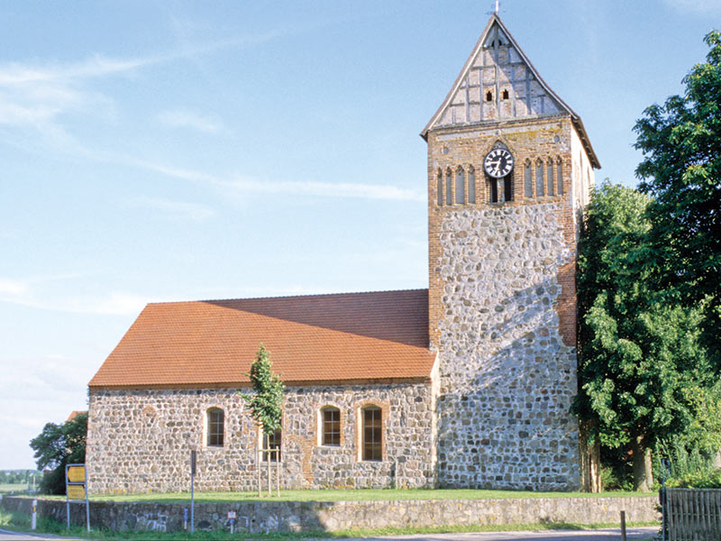 Flachgedeckter Feldsteinbau, Mitte 13. Jh. Fenster, Süd- und Westportale verändert, das Nordportal zugesetzt. Die ursprüngliche Dreifenstergruppe der Ostwand und die Fenster mit Feldsteinlaibung und Backsteinbögen teilweise noch zu erkennen. Der querrechteckige Westturm mit Satteldach nachträglich Anfang 16. Jh. vorgesetzt, das oberste Geschoss mit gekuppelten Schallöffnungen und Blenden in Backstein, die Giebeldreiecke in Fachwerk Anfang 17. Jh. erneuert.