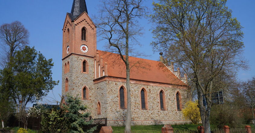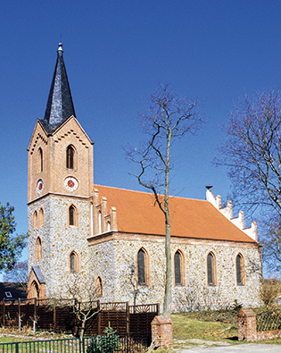 Neugotischer Saalbau von 1877, aus Natur- und Backstein mit zinnenbekröntem Ostgiebel, dort integriert der spätgotische polygonale Chor aus Feldstein mit Backsteinkanten, spätes 15. Jh. Der eingezogene Westturm mit hohem verschiefertem Helm. Instandsetzungen 2008/09.