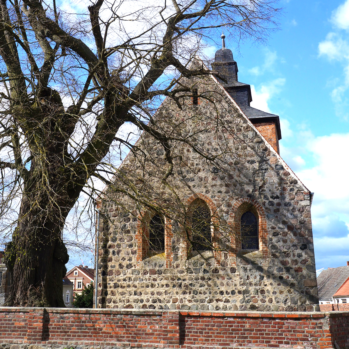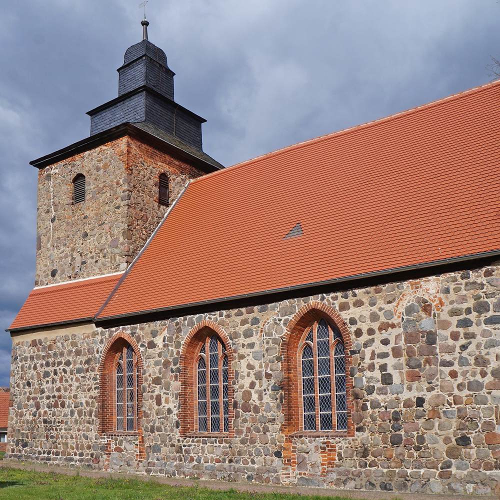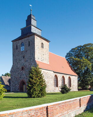 Flachgedeckter Feldsteinbau, 1. Hälfte 14. Jh. Sich verjüngender querrechteckiger Westturm, Ende 15. Jh., mit gestuftem, haubenbekröntem Aufsatz von 1677. Nach Sturmschäden Turmoberteil 1704 instandgesetzt. In der Ostwand drei bauzeitliche Lanzettfenster mit Backsteinlaibung, an der Südseite ein ebenfalls bauzeitliches Fenster erhalten. Die übrigen Fenster der Längsseiten und das Westportal im 19. Jh. vergrößert. Zwei Südportale verändert und zugesetzt.