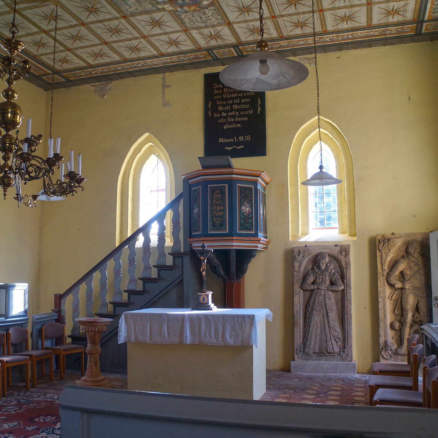 Bis etwa 1600 Grablege der Familie von Saldern. Zwei Epitaphe für die 1598 verstorbene Anna von Saldern, geb. von Klitzing, und den 1602 verstorbenen Jacob von Saldern, 2016 restauriert von Westfassade in die Kirche umgesetzt.